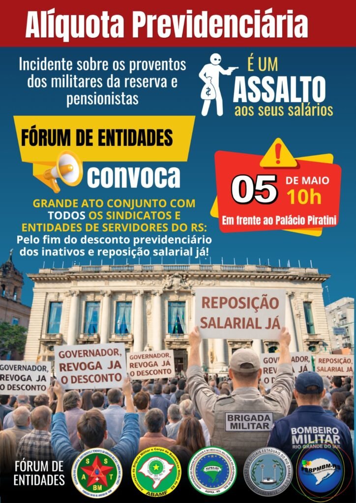 O FÓRUM DE ENTIDADES da BM (ABAMF, AOFERGS, ASPRA e FERPMBM), após reunião realizada na sede da ABAMF, em Porto Alegre, na quarta-feira (15/04), juntamente com os demais sindicatos e entidades de servidores públicos do RS, deliberou pela realização de uma mobilização de todos os servidores estaduais contra o desconto da alíquota previdenciária incidente sobre os proventos de aposentados e pensionistas, conforme decisão por maioria do STF – ADIs Federais: ADI 6.255/DF e ADI 6.258/DF, que atualmente está sob pedido de vista do ministro Gilmar Mendes.